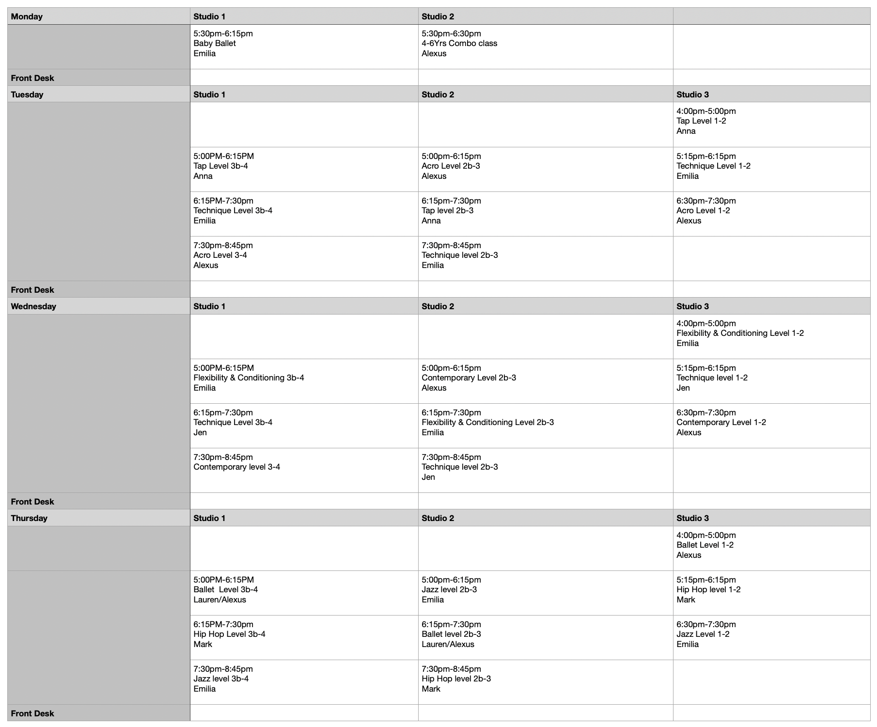 Dancers will train in a focused, supportive environment with our experienced staff. Classes are grouped by level to ensure proper placement and continued growth.